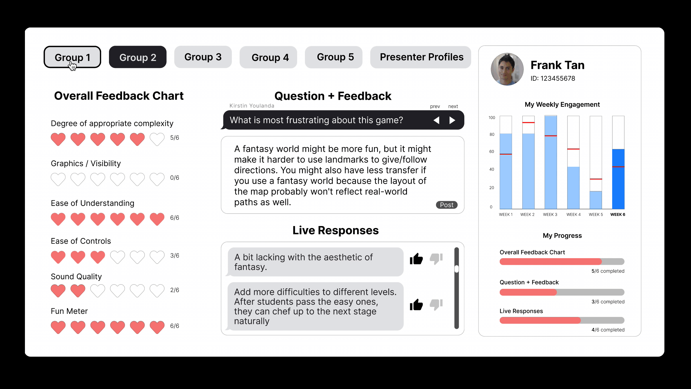 It is important to find ways on how to connect the instructor β listener β presenter and to see what type of things are overlapped and what are specifically designed for that user. This case also taught me the importance of making the interface interactive and responsive through animations. It is about feedforward/feedback. Overall, this interaction / animated task allowed me to better my skills in Figma as well and familiarize myself with the tools.